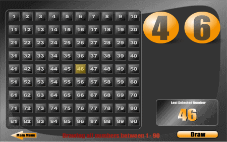 [Contents] Playing a UK Bingo/Housie Game in Quick Start You can play simple UK Bingo/Housie games in Quick Start without having to learn to use the Game Manager. Using Quick Start is the best way to get to know the ezDraw program. Click on the Quick Start button in theMain Menu. Then click on the UK Bingo/Housie button in the Choose Game Type screen to go to the Game Configuration/Display Options screen. Make any desired adjustments to the Display Options and click on the Next button to goto the Game Configuration/Set Number Range screen. The Number Range will be automatically set to 1-90 for UK Bingo/Housie games. Click on the Start Game button and proceed with your game. Click on the Print Tickets button to go to thePrint Tickets screen if your need tickets for your bingo game. Starting a draw in a UK Bingo/Housie game is the same procedure as for a raffle game in Quick Start. The only difference is that the display graphic changes to incorporate a virtual UK Bingo style gameboard which shows all numbers from 1-90 in rows of 10 and highlights numbers that have been drawn. When all 90 numbers have been drawn you cannot make any more draws and the game is over. The Play Game Display screen for UK Bingo/Housie games