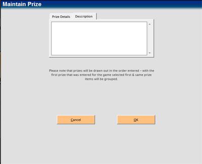 [Contents] Exporting and Printing Sponsor Lists Sponsor lists for games can be printed or exported to a text file. Click on the Print List or Export List buttons respectively on the Add Sponsors window to perform these functions. [Contents] Adding a Prize You can add numerous prizes to your new game (one for every draw) and numerous prizes of the same type. Prizes are drawn in the order entered and same type prizes are grouped together (ie drawn consecutively). To add a prize to a selected game, click on the Prizes button in the Game Manager. This will open the Prizes tab. Then, each time you want to add a new prize click on the Add New Prize button toopen the Maintain Prize dialog box. By default the Maintain Prize dialog box opens with the Prize Details tab selected. Once entered, prize details are displayed as a list in the Prizes window. The Maintain Prize dialog box in the Game Manager - Prize Details tab selected